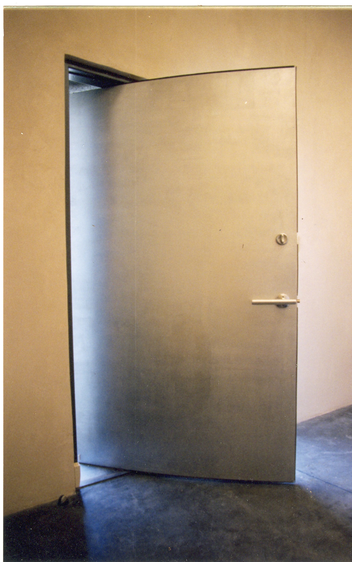 Center-pivot front door, shaped like the wing of a plane, for a contemporary home in Santa Fe, NM.